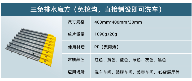 三免排水魔方由主體格柵、正邊條、反邊條三部分構成,通過雙層卡槽設計相互扣接,便于流水清污,易于安裝,即可快速構建起堅實的洗車地板地面,主要適用于不能開水槽的場所。