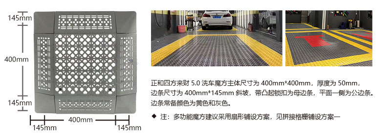 1. 分為3.4.5.厚度,解決不同厚度,統(tǒng)一紋路的問題 2. 啞光平紋設計,防滑,美觀,易清潔 3. 選用高級原料,加入其他輔料,顏色亮麗,無異味,無污染 4. 顏色為紅黃藍綠黑灰六色,滿足客戶用色需求,搭配屬于自己的風格 5. 通扣鎖扣設計,容易鋪設且容易拆卸打理 6. 加強支撐,不容易出現壓壞壓斷現象,滿足大多數車輛施工的要求 7. 使用年限長,五年超長質保,使用無后顧之憂 8. 十字支撐,保證承載最大化的同時,且易排泥排水