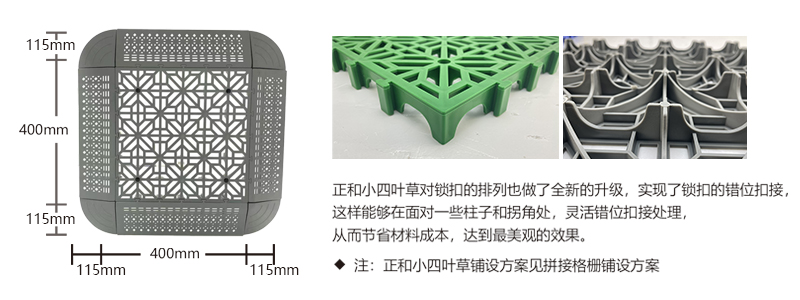正和小四葉草采用通扣設計,可以確保產品鋪設完成后在任何區域單獨取出,極大的方便了客戶后期局部清理泥沙等,給店面的日常衛生維護提供了很好的基礎。