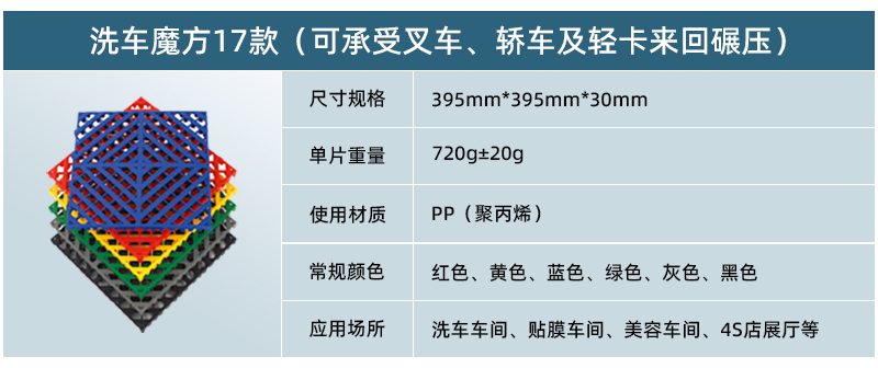 正和17款洗車魔方具有大孔徑排水和排泥沙的功能,下方支撐空間更大,鎖扣更加牢固,鋪裝方便快捷,效果美觀大方,解決了地下室、地暖系統(tǒng)的洗車難題,成為洗車車間地面的全新選擇。洗車魔方集玻璃鋼格柵的超強(qiáng)承載,排水排沙功能和拼接格柵的色彩絢麗,安裝方便功能于一身,是一款真正免挖溝一次性解決洗車間地面問題的超高性價比產(chǎn)品!